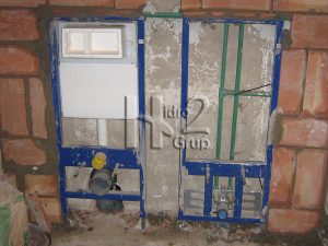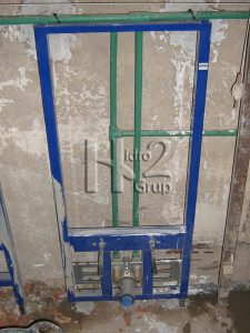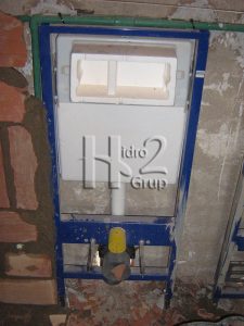 A las estructuras van sujetas también las tomas de agua y los desagües, y la del inodoro lleva también encajada la cisterna de agua que quedará oculta en la pared.